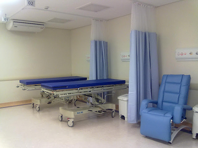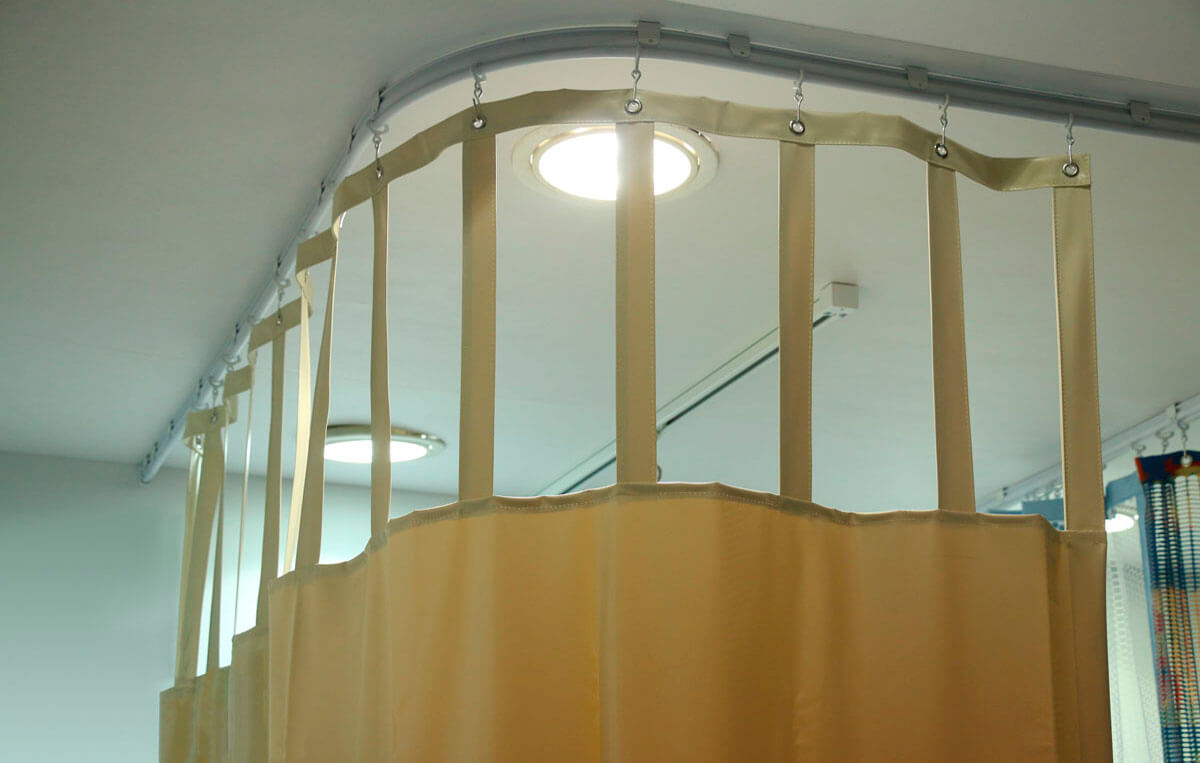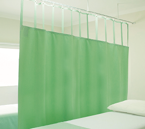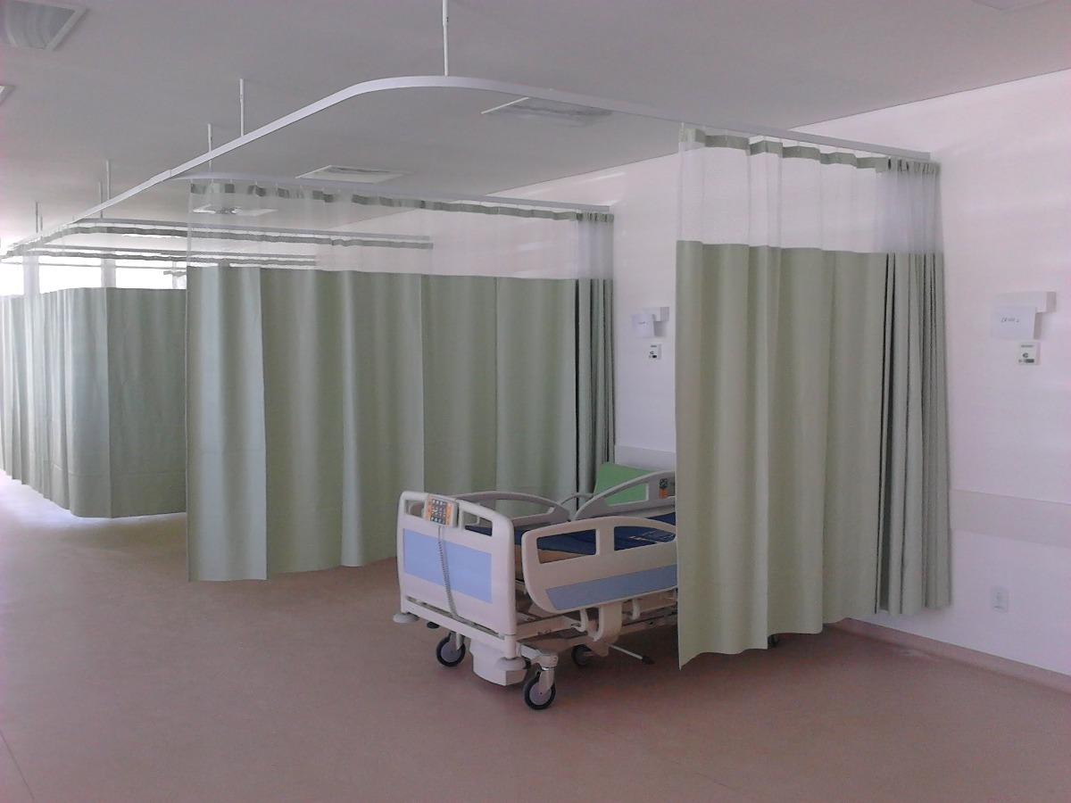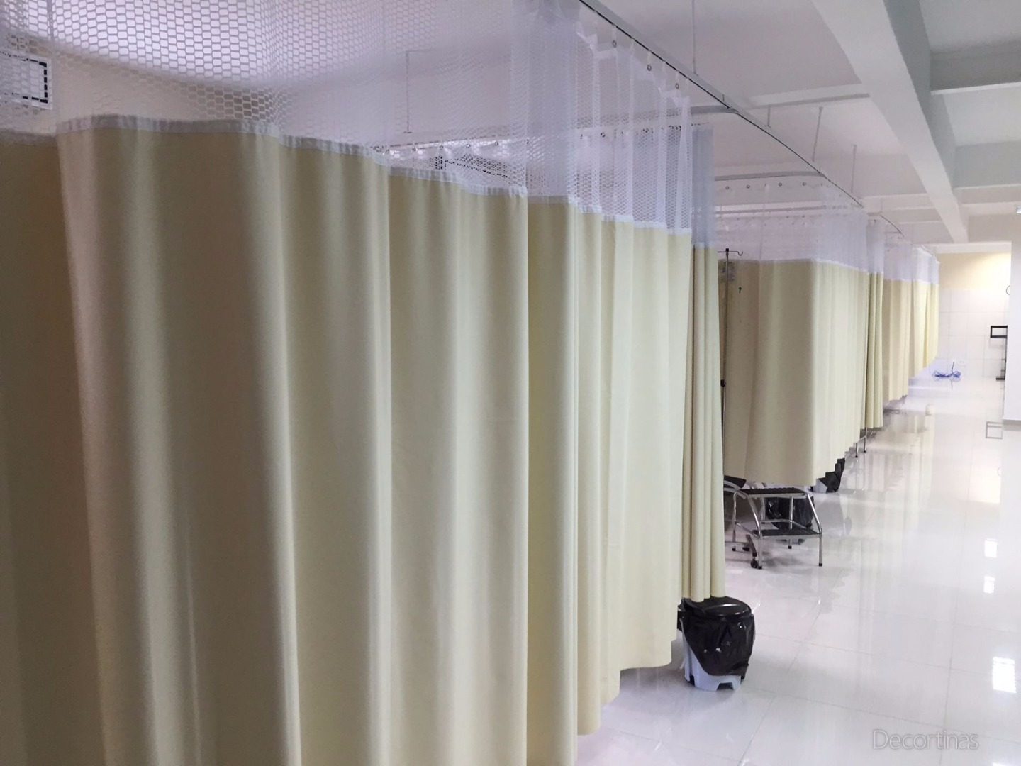 Cortinas divisória para leito hospitalar em tecido 100% Trevira ou Poliéster, anti-bactericida e Fungicida com tela ou tiras. Sistema de trilho curvo ou reto.
